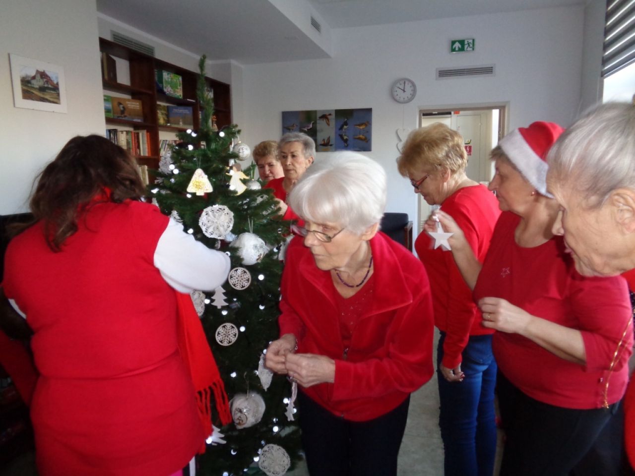 W tym dniu dodatkowym atutem spotkania był dominujący w ubiorze każdego Seniora czerwony kolor. Dużo radości było z otrzymanych kamizelek ostrzegawczych. Wszyscy Seniorzy w tych kamizelkach wykonali integracyjny taniec. Wiele radości sprawiło wspólne ubieranie choinki.