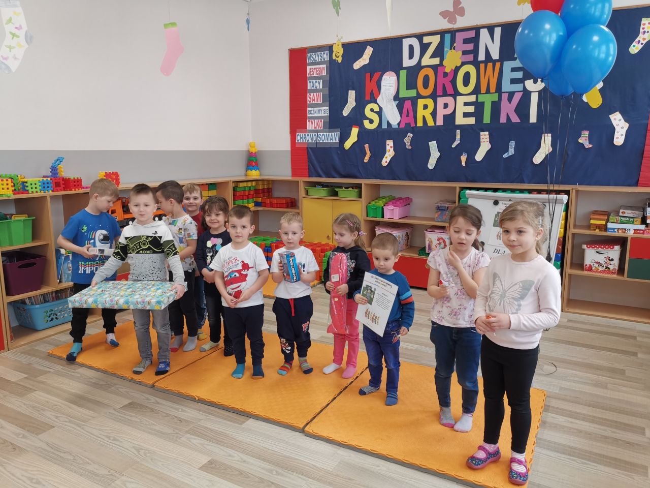 W piątek 19.03.2021r. w Przedszkolu w Nabyszycach obchodziliśmy Dzień Kolorowej Skarpetki, czyli Światowy Dzień Zespołu Downa. Z tej okazji zaproszenie dostał absolwent naszego przedszkola – Hubert. Wspólnie z dziećmi zorganizowaliśmy małe przyjęcie. W przedszkolu zrobiło się bardzo wesoło i kolorowo. Dzieci wykonały skarpetkowe laurki, był pyszny tort przygotowany przez panią Halinkę oraz konfetti, prezenty no i oczywiście odśpiewaliśmy tradycyjne „Sto lat!”. Towarzyszyło temu dużo radości i zabawy. Wszyscy – dzieci, panie i pracownicy przedszkola założyliśmy kolorowe skarpetki, w dodatku nie do pary. Chcieliśmy w ten sposób pokazać, że los osób z Zespołem Downa nie jest nam obojętny, że osoby z Zespołem Downa żyją wśród nas. Tak jak my – bawią się, śmieją, spełniają swoje marzenia bez względu na różnice w liczbie chromosomów. Zwięczeniem tego dnia był uśmiech Huberta i radość jego mamy. Do akcji solidarność z dziećmi z Zespołem Downa włączyli się również uczniowie klas 4-8 wraz z nauczycielami, wysyłając zdjęcia w kolorowych skarpetkach.