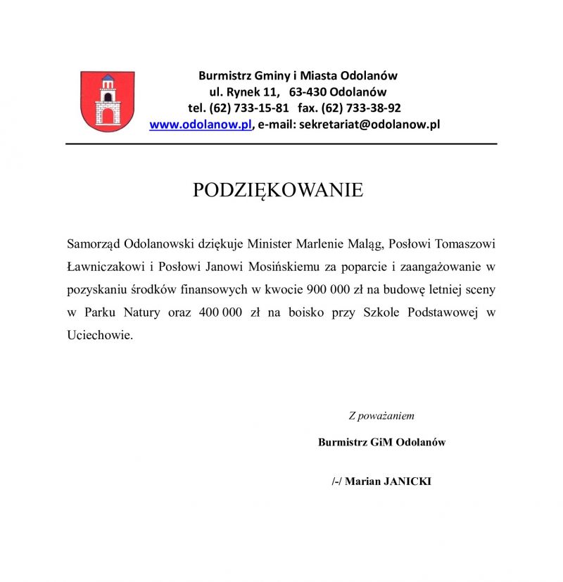 Burmistrz Gminy i Miasta Odolanów dziękuje za pozyskane środki finansoweautor: UGiM Odolanów, data: 2021-04-02« wstecz