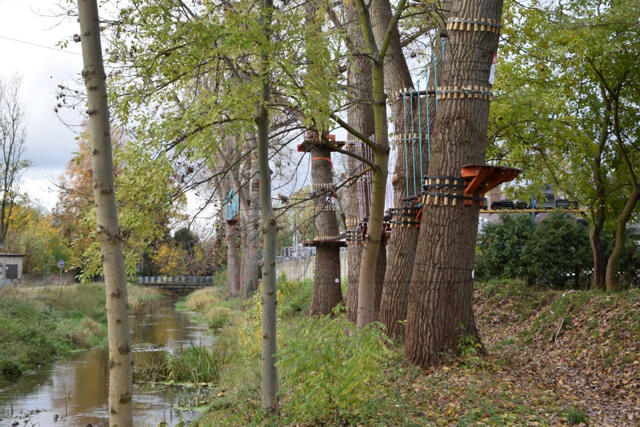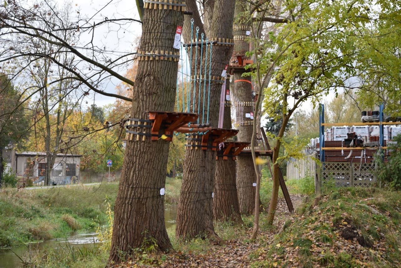 • Trasa wysoka – przeznaczona dla dorosłych. Zostanie poprowadzona przy oraz nad rzeką Barycz. W ramach tej trasy wybudowane na drzewach zostaną platformy z przeszkodami oraz zjazd tyrolski nad rzeką. Długość trasy wysokiej będzie wynosić ok. 170 m